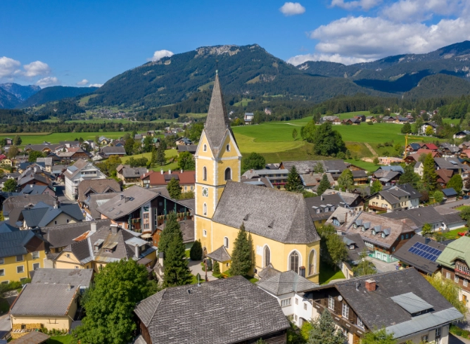 Bad Mitterndorf liegt zwischen Dachstein und Grimming und bietet eine ruhige, weitläufige Naturkulisse. Der Ort ist bekannt für seine Thermen, klaren Bergluft und ideale Lage für Wandern, Skifahren und Langlauf.